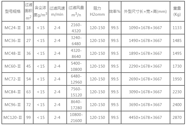 MC-II型單機脈沖除塵器的技術(shù)性能: